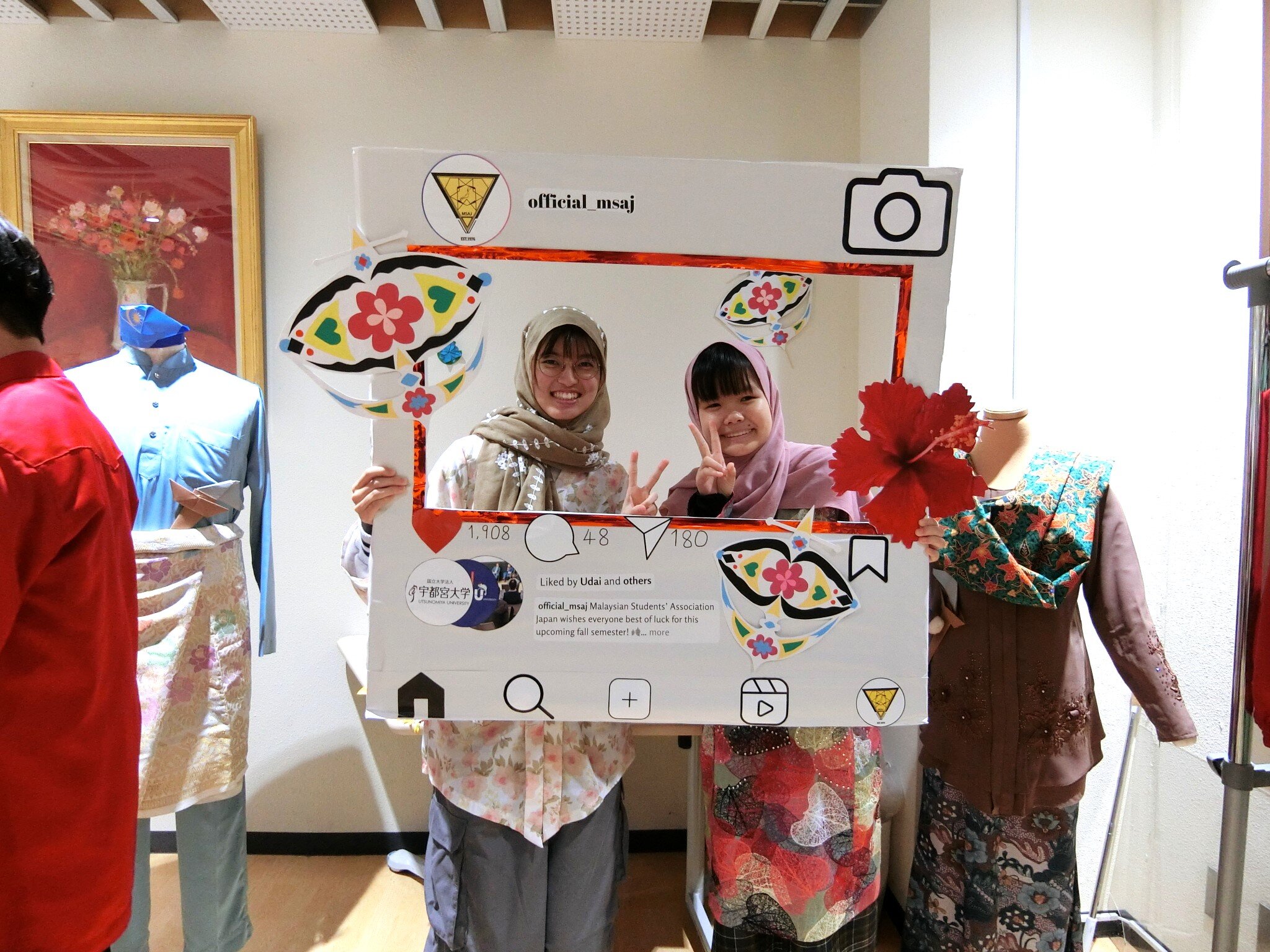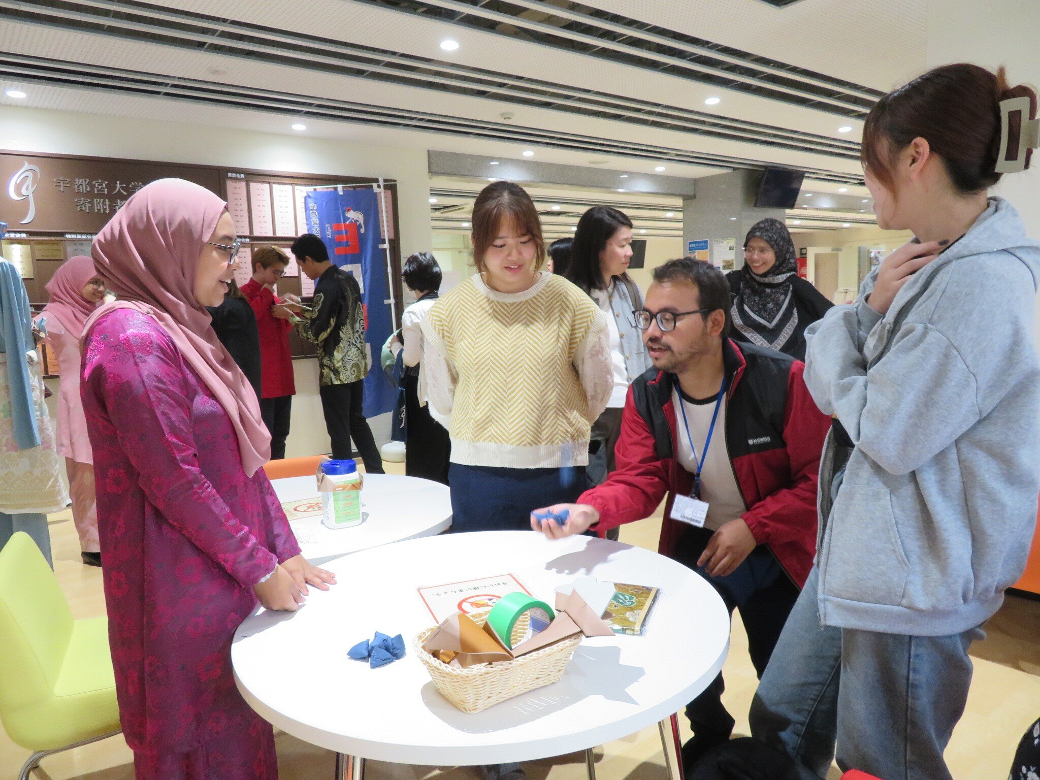 サラワク大学訪問団の来学に合わせ、留学生・国際交流センターは、10月7日(月)から10月11日(金)までの5日間、マレーシアの文化を紹介するイベント「マレーシアウィーク」を実施しました。本学のマレーシア人留学生が伝統的な衣装・手芸・ゲーム・アートなどを紹介し、多くの日本人学生や他国からの留学生が異文化体験を楽しみました。また、サラワク大学での英語研修プログラムに参加した学生の思い出の写真の展示も行われました。