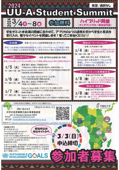 文部科学省「大学の世界展開力強化事業~アフリカ諸国との大学間交流形成支援~」令和2年度採択「アフリカの潜在力と日本の科学技術融合によるSDGs貢献人材育成プログラム」(通称:UU-A)の令和5年度事業の一環として、アフリカの6つの連携大学から学生と教員を受け入れ、様々なイベントを開催します。ぜひご参加ください。