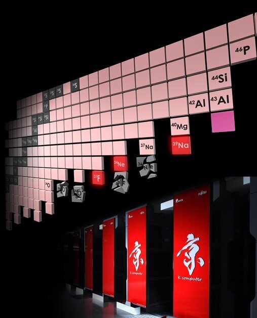 図1:本研究の内容を端的に表すイラストレーション。この図の上部は図2の上部をグラフィカルに変えたものである。フッ素(F)、ネオン(Ne)、ナトリウム(Na)のドリップラインが赤い四角で示され、ピンクの四角はマグネシウムのドリップラインの理論予言である。さらに詳しい説明は本文、及び、図2のキャプションを参照されたい。この図の下部は本研究で使われた京コンピュータの写真であり、理化学研究所提供のものに基づいている。