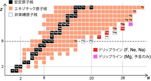◆原子核は陽子と中性子の塊であり、陽子や中性子の数が最大いくらになれるかは、学術上重要な基本的問題である。陽子の数(Z)の上限は最も重い元素を意味する。一方、ある元素において最大の中性子数(N)の原子核は中性子ドリップラインと呼ばれ、その全容は分かっていない。ドリップラインは宇宙での元素合成などにも関わり、学際的な意義も大きい。