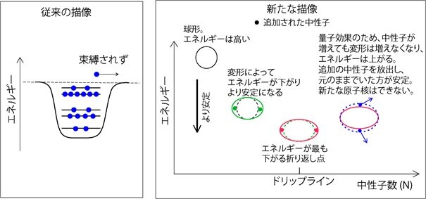 本研究では、酸素より原子番号が大きい(図2では上の並びになる)フッ素(Z=9)、ネオン(Z=10)、ナトリウム(Z=11)、マグネシウム(Z=12)でのドリップラインを研究し、それらではこの描像が成立たず、別の新たなメカニズムが現れることを示した。それが図3の右側のパネルに、原子核の形の変形(注3)と結び付けて、模式的に示されている。横軸は中性子数を示す。左端では原子核は球形である。中性子数を増やすと、核力の効果として、球形から楕円体への変形が起こり、同時に結合エネルギーが増大する。それは原子核のエネルギーが下がることを意味する(図3の右側パネルの左から2番目の状態)(注3)。中性子数をさらに増すと、変形度はさらに大きくなり、エネルギーはさらに下がる。エネルギーが下がるとそれだけ安定性が増すので、中性子を加えた原子核は加える前よりもさらに安定であり、存在する。このようにしてエネルギーが下がり続ける限りは中性子を追加できることになる。しかし、楕円体の変形度は際限なく大きくはなれず、あるところで最大の変形度に達する(図3の右側パネルの左から3番目の状態)。その限界を越すと変形は弱まってエネルギーを下げなくなり、他の効果で多少の「延命」を得ても、そのあたりの中性子数でエネルギーは上昇に転じる(図3の右側パネルの左から4番目の状態)。エネルギーが上昇すると、中性子数を増やしても安定度は増さないので、元のままの方がよく、この原子核は存在できない。このようにして、原子核の存在限界は変形度の変化(形の進化ともいう)によって基本的に決まる、というのがこの研究の結論である。