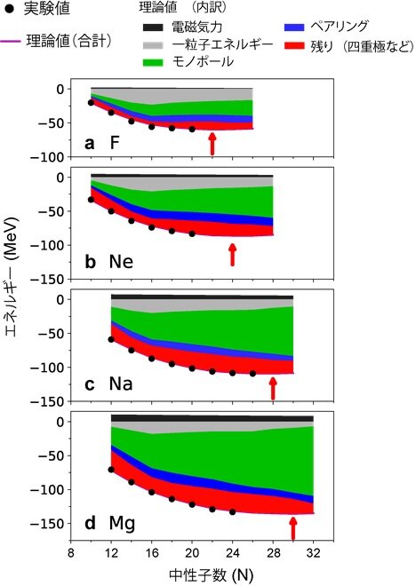 図4:原子核の基底状態エネルギーをフッ素、ネオン、ナトリウム、マグネシウムのアイソト―プに対して示したもの。横軸は中性子数、縦軸はエネルギーでありMeV単位で示されている。黒い点は実験データである。理論計算値はその起源によって色分けされており、赤い部分の最下部が全体の合計でもある。それは紫の線で示されており、理論計算値の合計である。内訳の内容は図の上部に示されているが、専門的になるのでここでは省く。理論値と実験値の良い一致が見られる。赤い矢印はドリップラインを示す。マグネシウムの場合には、実験的には明らかになっていないので、理論予言のみとなる。エネルギーを定量的に測定する実験の方が、原子核の有無を決めるドリップライン決定の実験よりも難しいので、赤い矢印と黒い点は離れていても問題はない。