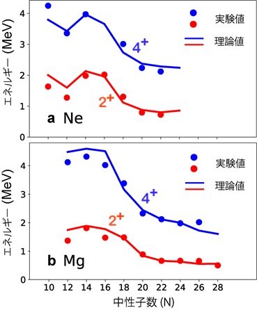 図5:ネオン、及び、マグネシウム・アイソトープの励起エネルギー準位の理論値と実験値の比較。スピン・パリティが2+、及び、4+である第1励起状態に対して示されている。横軸は中性子数、縦軸は励起エネルギーがMeV単位で示されている。