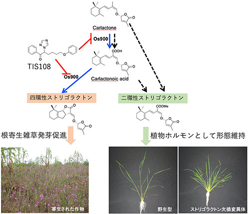東京大学大学院農学生命科学研究科 浅見忠男教授、東京農業大学生命科学部 伊藤晋作准教授、宇都宮大学バイオサイエンス教育研究センター 野村崇人准教授、サウジアラビアKing Abdullah University of Science and TechnologyのSalim Al-Babili教授らの共同研究チームは、四環性ストリゴラクトン特異的な生合成阻害剤TIS108を開発し、この化合物を処理したイネにおいては四環性ストリゴラクトン量が減少するにもかかわらず、収量に大きな影響をあたえる過剰な枝分かれが誘導されないことに加えてAM菌の共生が可能であることを見出しました。これらの発見はこれまでの常識を覆し、二環性ストリゴラクトンは植物ホルモンとしての機能が、四環性ストリゴラクトンは根圏のシグナル物質としての機能が主要であるという知見をもたらしました。続いて四環性ストリゴラクトン生合成のみを阻害できるこのTIS108処理したイネやTIS108の標的酵素をコードする遺伝子の働きをゲノム編集で抑えたイネでは、期待通りに根寄生雑草被害が大きく低減することも見出しました。