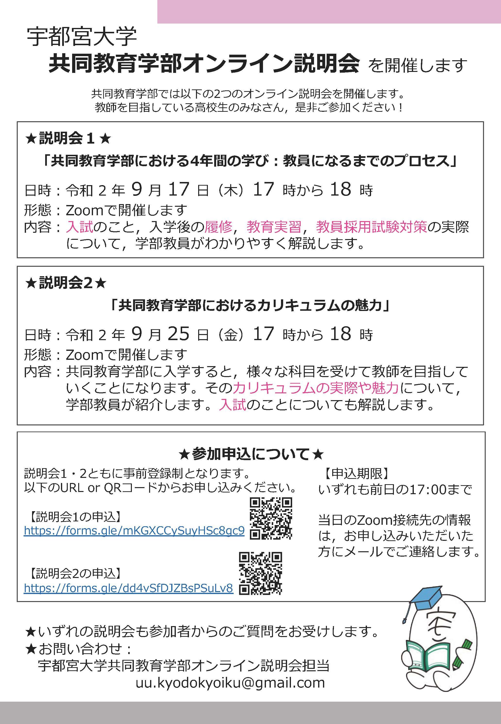 2020年9月17日(木)と25日(金)に共同教育学部オンライン説明会を実施します。