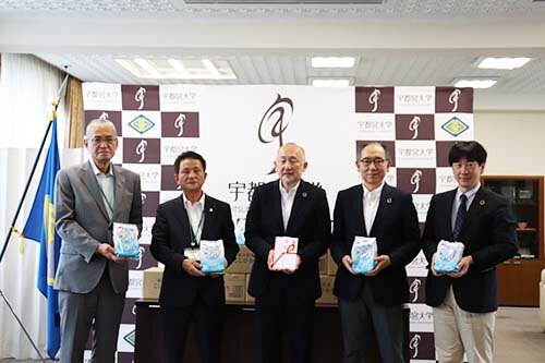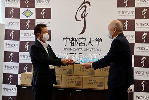 このたび、JA栃木中央会から、新型コロナウイルス感染症が学生生活に与える影響に鑑み、学生に対する生活支援として、パックご飯2,400食分を無償提供いただき、8月25日(水)に学長室において贈呈式を行いました。