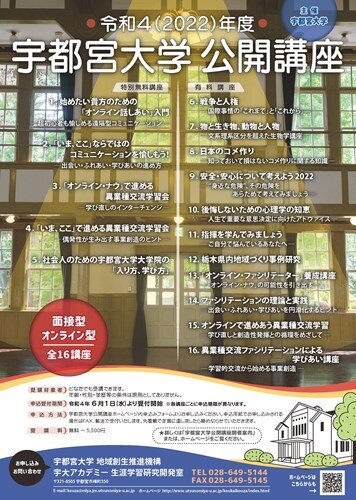 2022(令和4)年度については、合計16講座(無料特別講座5講座、有料講座11講座)を開催いたします。新型コロナウイルスの感染状況等を見計らいながらも、オンライン形式だけでなく、面接型(直接対面型)の講座も実施予定です。Zoomが初めての方におすすめの講座も設けておりますので、関心のある方のご参加をお待ちしております。
