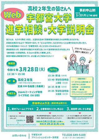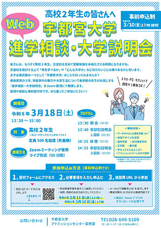 検討をする上で、「どんな大学か」や「学びたい学問が学べるか」など、知りたいことはたくさんあるかと思います。そんな皆さんの参考となるよう、「学部学科の特徴」や「宇大の魅力」について各学部の先生がお話しする「進学相談・大学説明会」をオンラインで開催します。ぜひご参加ください!