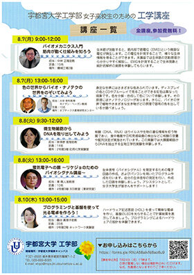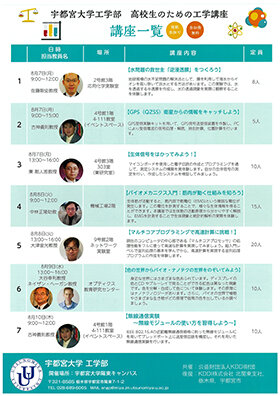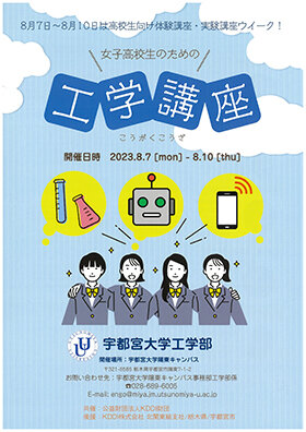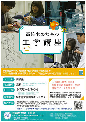 高校生の皆さんに楽しく勉強してもらえる特別講座として「高校生のための工学講座」、「女子高校生のための工学講座」をご用意しました。どの講座も、面白くてワクワクする内容になっています。 参加費は無料ですので、ぜひお気軽にご参加いただき、宇都宮大学工学部の魅力をご体感ください。