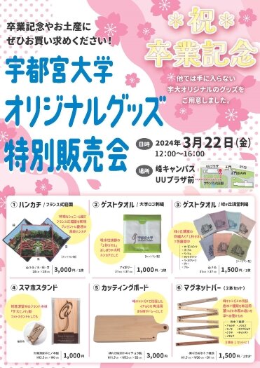 宇都宮大学オリジナルグッズ特別販売会を3月22日(金)の学位記授与式終了後に峰キャンパスUUプラザ前で開催します。峰キャンパスの伐採樹木を活用した商品や、高級タオルメーカーとのコラボ商品など他には手に入らないオリジナルグッズです。
