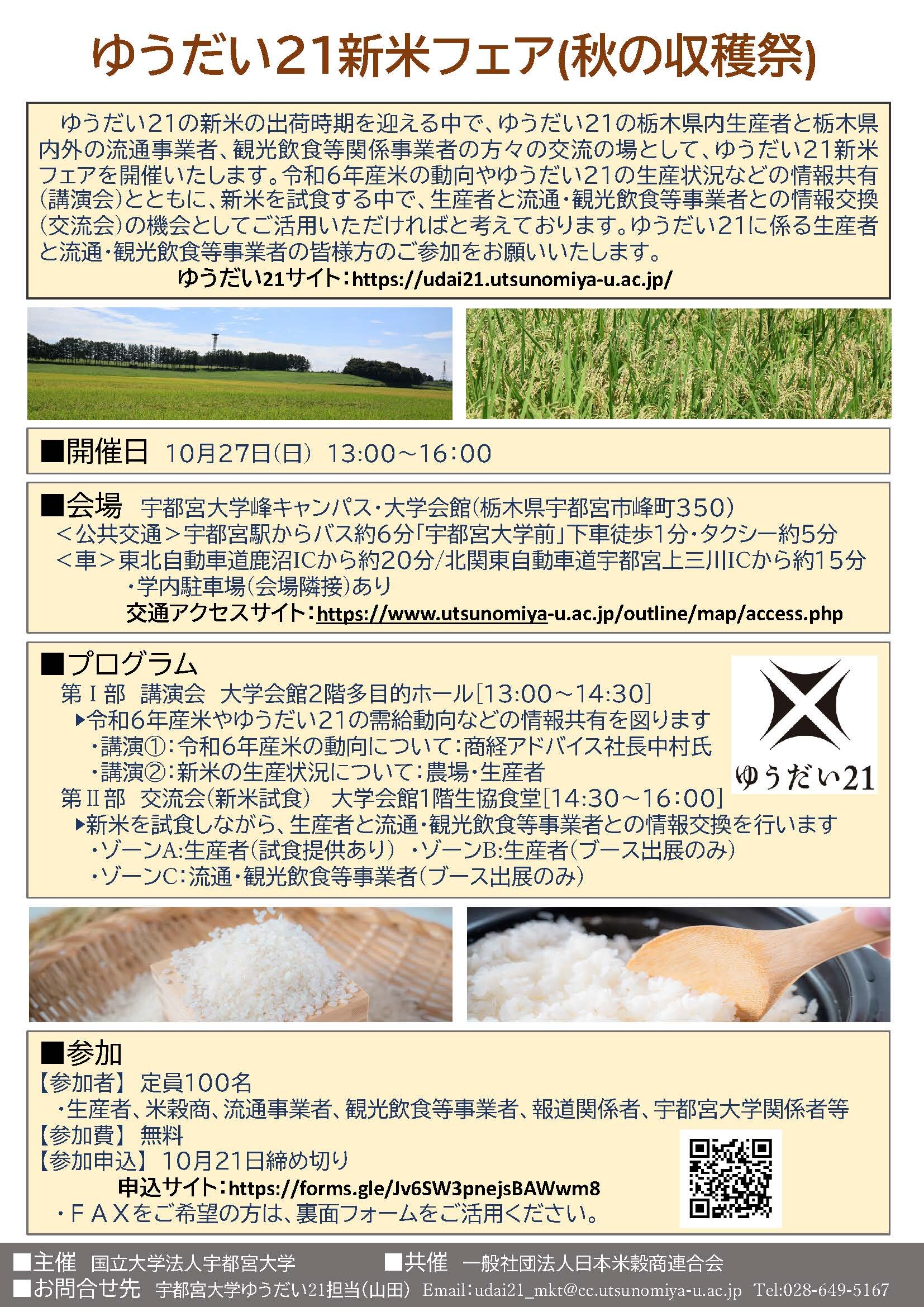 ゆうだい21の新米の出荷時期を迎える中で、ゆうだい21の栃木県内生産者と栃木県内外の流通事業者、観光飲食等関係事業者の方々の交流の場として、ゆうだい21新米フェアを開催します。