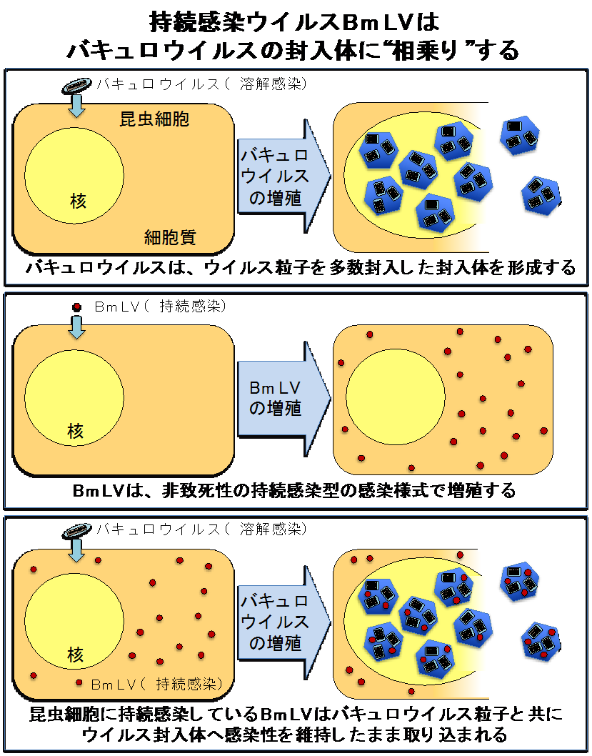本研究成果により、封入体への"相乗り"という、BmLVとバキュロウイルスの新たな相関の形が明らかとなりました。近年、BmLVに類縁性を有する様々な持続感染型ウイルスがカイコ培養細胞だけでなく、ハチ、ダニ、蚊などから単離されています。今後、これらの"植物ウイルス様昆虫ウイルス"と同一個体に感染する溶解感染型ウイルスとの間に、どのような相関の形があるのか興味が持たれます。本研究は、文部科学省科学研究費補助金(16K08095、25450482、16H05051)による支援を受けて行われました。