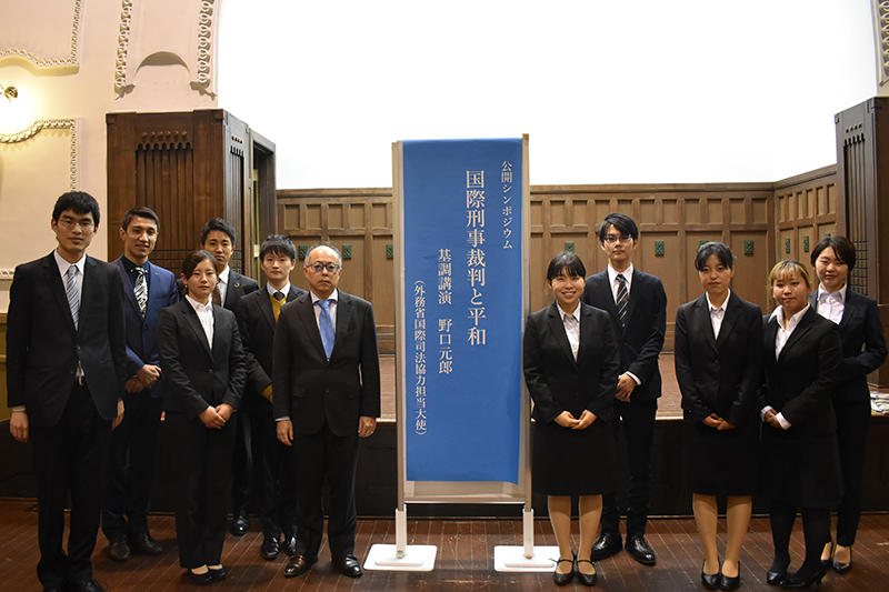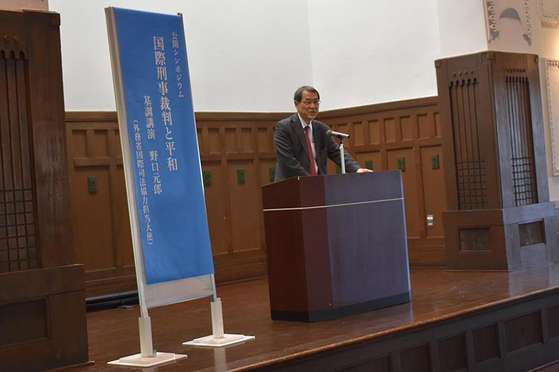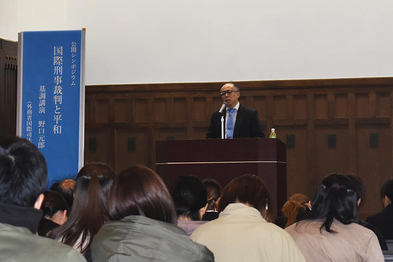 11月15日、宇都宮大学国際学部・国際学部附属多文化公共圏センター共催の公開講演会が開催され、外務省から野口元郎国際司法協力担当大使をお招きし、国際刑事裁判と平和についてご講演いただきました。国際的なキャリア形成のお話のなかでは、キャリアは自然に出来るものではなく、自らが動き作るものであるとの力強いメッセージをいただきました。