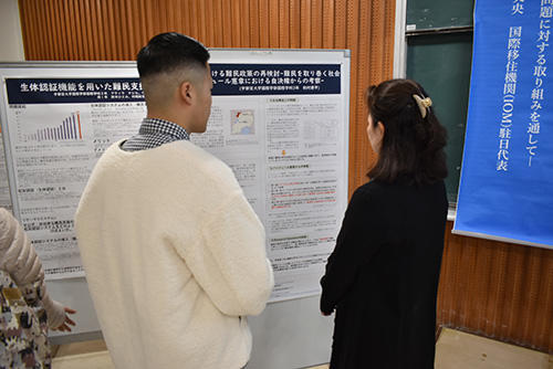 佐藤駐日代表の基調講演では「国際移住機関の活動とSDGs:移民・難民問題に対する取り組みを通して」と題し、人の移動とSDGsについての様々な課題や取り組みの全体像をご説明いただき、具体的な事例として佐藤駐日代表のアフガニスタンでのご経験をお話いただき、非常に貴重な機会となりました。また、難民問題に関する国際連携教育事業学生実行委員会の代表による研究報告とポスター発表も行われました。