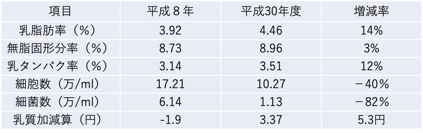 宇都宮大学では、乳牛の飼養管理について、行動学的および栄養学的なアプローチでウシの健康と快適性を向上させ、生乳の質の向上を目指してきました。具体的には、農場の広大な土地を利用した自給粗飼料の生産、液状Ca剤を用いた周産期の低Ca症予防、 トンネル換気を用いた畜舎衛生および暑熱ストレスの緩和など、 大学で実施した試験研究結果を日常の飼養管理に取り入れてきました。結果的に、年間を通じた生乳の品質は飛躍的に向上しました(表1)。