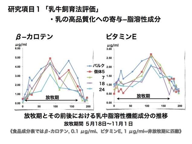 宇都宮大学では、日本においては搾乳牛では数少ない放牧飼養で管理され、 自由な採草と適度な運動や日光浴によるストレス低減に取り組んでいます(図2)。 その結果、「純牧」には、生乳中の様々な成分、例えばβカロテンやビタミンE、共役リノール酸など、ウシにもヒトにも健康に良い成分が豊富に含まれます(図3)。さらに、生乳の乳脂肪中に溶け込んだこれらの成分をできる限りそのまま活かす「ノンホモジナイズド製法」が用いられ、放牧乳の旨味が引き出されています。