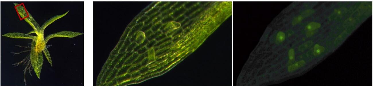 図1 ヒメツリガネゴケを、DNA損傷を引き起こすゼオシン溶液に6時間浸けた後、ゼオシンを洗い流して培養すると、葉の細胞が幹細胞(中央の写真で出っ張っている細胞、右の写真で光っている細胞)になって伸びだしてくる。中央と右の写真は左の写真の赤枠部分を拡大。