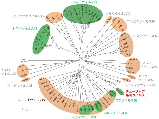ブニヤウイルス目に属するウイルスの複製酵素の全長アミノ酸配列を基に作成した分子系統樹。緑色は植物に感染するウイルスを表している。チューリップ条斑ウイルスは図の右下に赤字で示している。