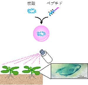 今回、共同研究チームは、「細胞透過性ペプチド(CPP)[2]」を基盤としたナノサイズの担体を用いてスプレーで噴霧することで、核酸を植物へ導入することに成功しました。この手法により、植物細胞内または葉緑体内で、導入した外来DNAから一過的にそのタンパク質を産生させ、また、siRNA[3]の導入により植物細胞内で目的タンパク質の発現を抑制することに成功しました。