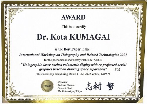 熊谷幸汰助教が、International Workshop on Holography and Related Technologies 2021でBest Paper Award を受賞しました