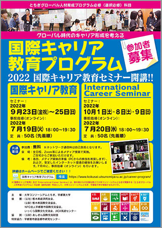 宇都宮大学では、国際キャリア教育プログラム「国際キャリア教育」「International Career Seminar」を開催しています。例年、宇大生のみならず、全国からの大学生、社会人、高校生に参加いただいてきました。今年度はCovid-19禍における取り組みとして、Zoomによるオンライン集中講義形式で開催いたします。国際キャリア経験豊富な講師たちとともに、3日間じっくりと国際協力や多文化共生等について一緒に学び、国際社会や地域社会へのCareer Pathを探ってみませんか?受講を完了した方には、独自の修了証もお渡しします。皆さんの参加を心よりお待ちしています。