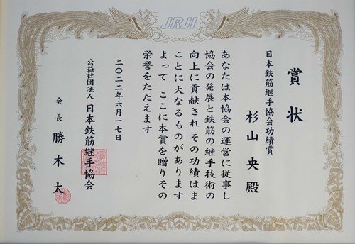杉山教授は、この鉄筋継手の品質確保を目的とした調査研究や事業を展開している公益社団法人日本鉄筋継手協会の会長(2019~2021年)、副会長(2017~2019年)、理事(2013~2017年)、各種委員会の委員長を務め、同協会の発展に寄与するとともに、鉄筋継手技術の向上に貢献しました。これらの功績が評価され、このたび功績賞が贈られました。