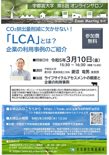 地域創生推進機構と産学交流振興会では、地域や産業界との共創を深めるため、宇都宮大学の様々な分野におけるオンラインサロンを開催しています。第8回目となる今回の講演テーマは「ライフサイクルアセスメントの概要と企業の利用事例」です。皆さまのご参加をお待ちしております。