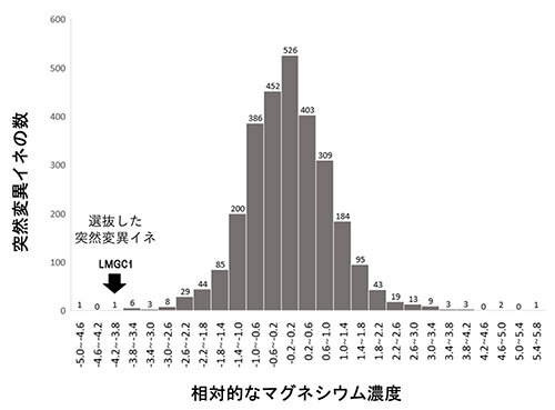 突然変異イネの相対的なマグネシウム濃度の分布図