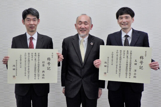 3月8日(水)、卓越教員称号付与式が執り行われ、2名の教員に対して、それぞれ卓越教授・卓越准教授の称号を付与しました。「卓越教員制度」は令和3年度から始まった称号付与制度で、世界水準の優れた研究業績を有し、今後更なる研究の進展が見込まれるとともに、本学の名誉を著しく高めることが期待できる教員に対し、3年間称号を付与するものです。今回称号を付与されたのは、工学部の杉原興浩 教授、玉田洋介 准教授です。