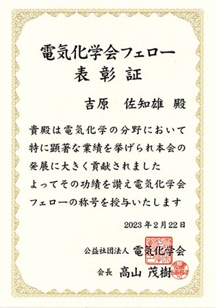 工学部の吉原佐知雄准教授が2023年度電気化学会フェローの称号を授与されました