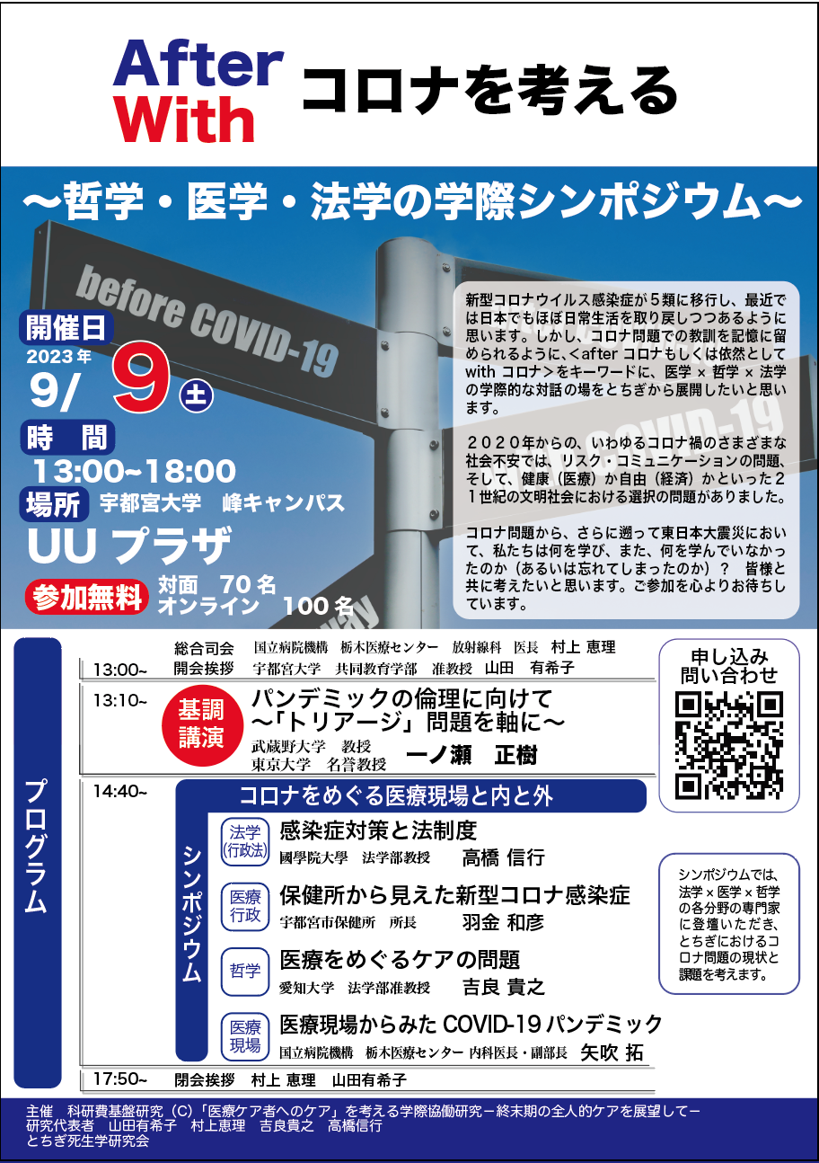 新型コロナウイルス感染症が5類に移行し、最近では日本でもほぼ日常生活を取り戻しつつあるように思います。しかし、コロナ問題での教訓を記憶に留められるように、<afterコロナもしくは依然としてwithコロナ>をキーワードに、医学×哲学×法学の学際的な対話の場をとちぎから展開したいと思います。