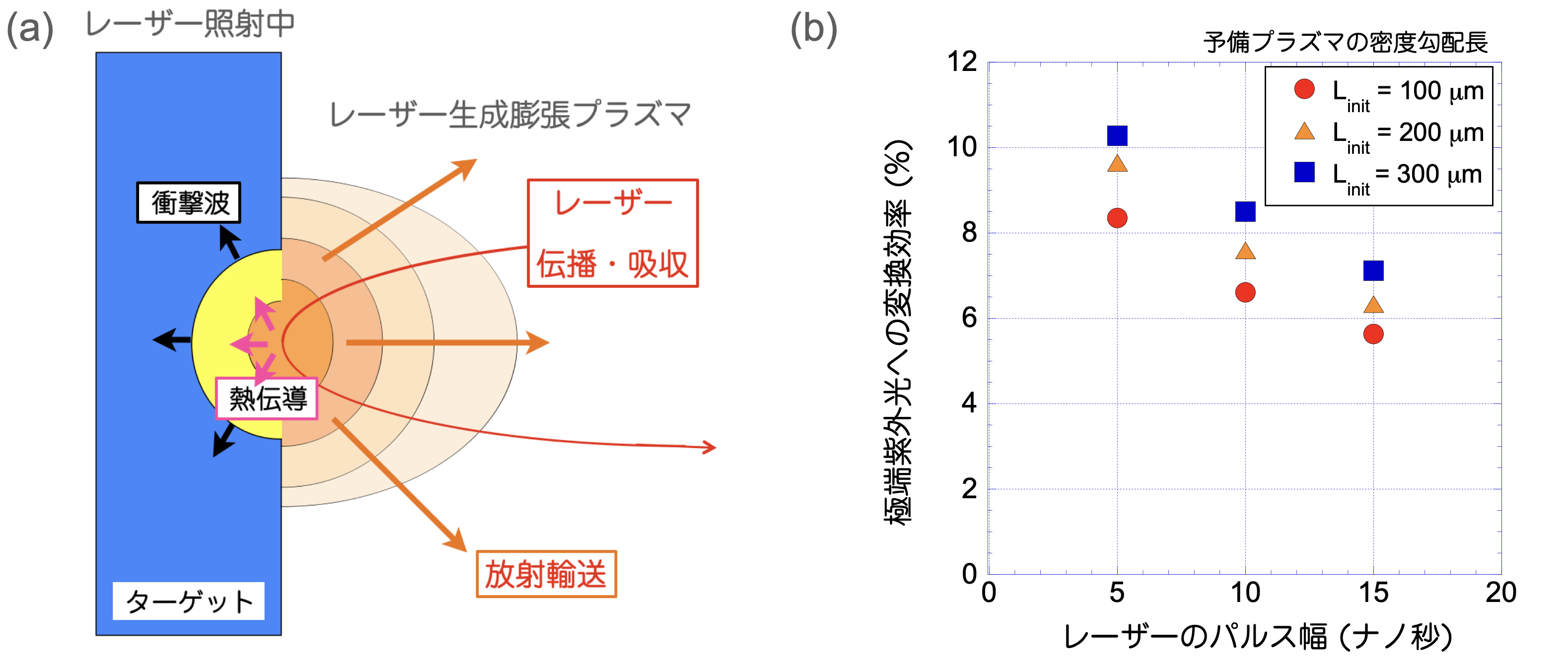 図(a)放射流体の計算の仕組み 図(b)EUV変換効率の密度勾配長、レーザーパルス幅依存性