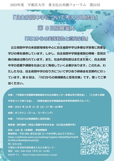 [イベント]多文化公共圏フォーラム第21回 自主夜間中学について考える研修会 第8回 「川口からの実践報告と意見交換」を開催します(10/21)