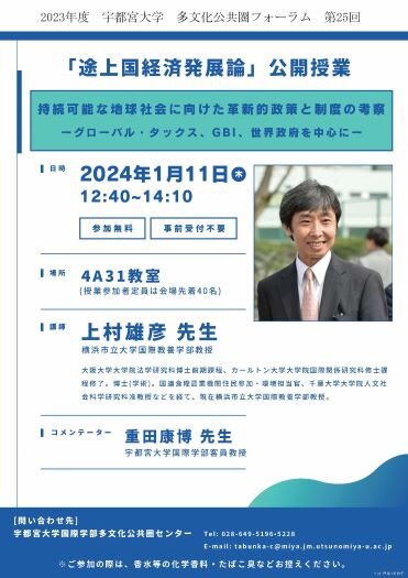 第25回目の多文化公共圏フォーラムは、「持続可能な地球社会に向けた革新的政策と制度の考察 -グローバル・タックス、GBI、世界政府を中心に-」と題して「途上国経済発展論」の公開授業を開催します。