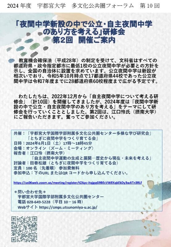 多文化公共圏フォーラム第10回「夜間中学新設の中で公立・自主夜間中学のあり方を考える」研修会 第2回を開催します (6/1)