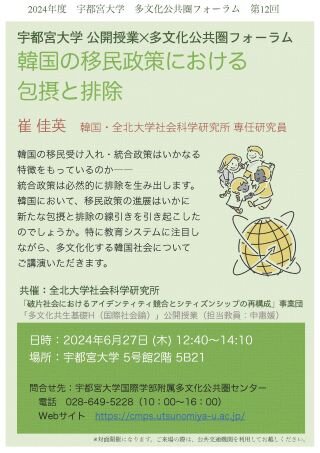 多文化公共圏フォーラム第12回「韓国の移民政策における包摂と排除」を開催します (6/27)