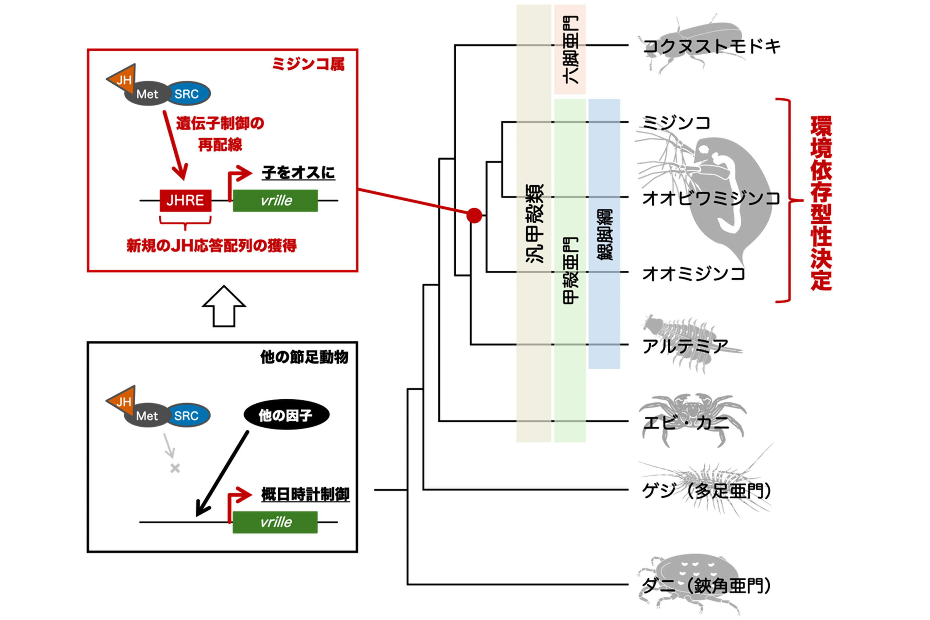 そこで本研究では、ミジンコのゲノムを詳細に解析することで、vrille(vri)遺伝子が、JH(幼若ホルモン)受容体複合体(Met/SRC)によって直接働きかけられる「JH標的遺伝子」であることを明らかにしました。この遺伝子は、JHの働きによってDNA上で「スイッチが入る(遺伝子がオンになる)」ようになり、それにより対応するRNAが作られやすくなることが分かりました。さらに、ミジンコのvri遺伝子には、近縁の節足動物には見られない配列が存在しており、ゲノム編集でこの配列を取り除いたミジンコでは、JHによるvriの発現とオス産生の誘導が減弱することを示しました。
