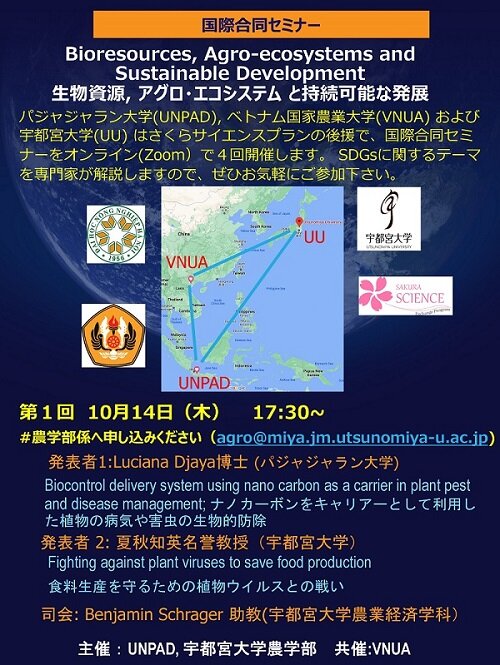 パジャジャラン⼤学(UNPAD)、 ベトナム国家農業⼤学(VNUA) および宇都宮⼤学(UU) はさくらサイエンスプランの後援で、国際合同セミナーをオンライン(Zoom)で4回開催します。SDGsに関するテーマを専⾨家が解説しますので、ぜひお気軽にご参加下さい。