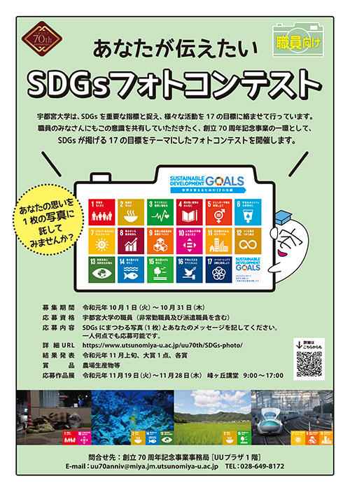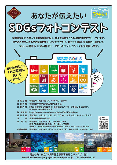 この意識を学生及び職員に共有してもらうことを目的に、創立70周年記念事業の一環として、「あなたが伝えたいSDGsフォトコンテスト」を実施します。