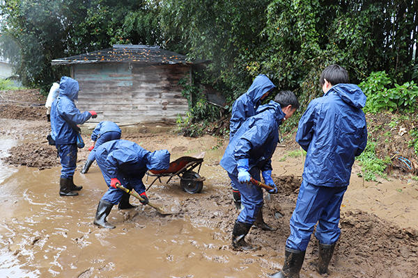 時折強い雨が降る中、被災者の方が1日も早く日常の生活を取り戻せるよう、学生たちは真剣に取り組んでいました。