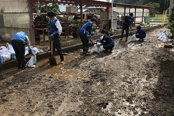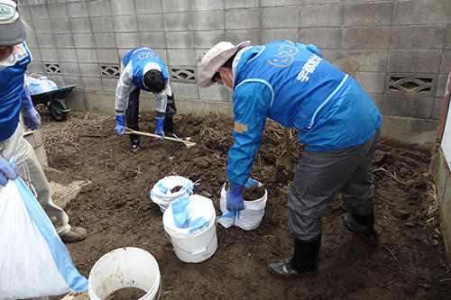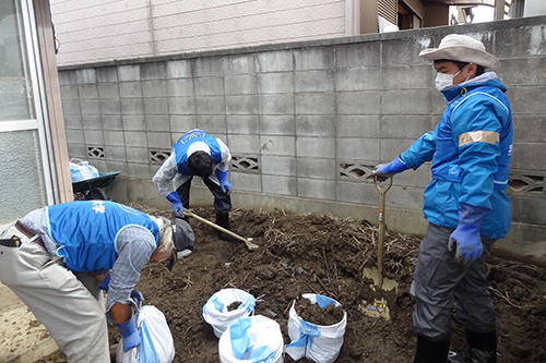 被災者方の庭の泥出し作業や、土のう袋に詰める作業を実施しました。