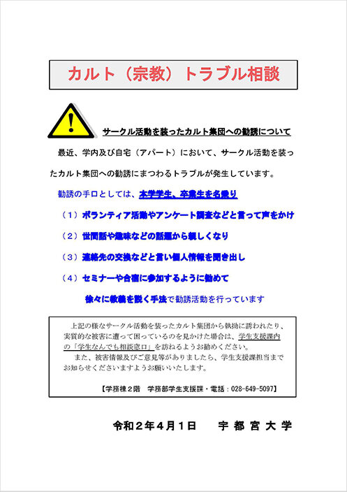 これまでも、サークル活動やボランティア活動、アンケート調査などを装って勧誘するカルト的宗教団体の被害について注意喚起してきましたが、このような団体に取り込まれると、正常な学生生活が送れなくなるばかりでなく、将来にわたって家族や友人との関係を壊されたり、自分の人格をも破壊されてしまいます。