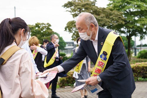 学生に啓発チラシを配布する池田学長