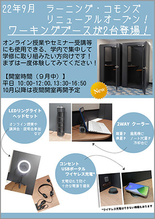 [在学生の皆さんへ]ラーニング・コモンズをリニューアルオープンしました!(ワーキングブースが設置されました)