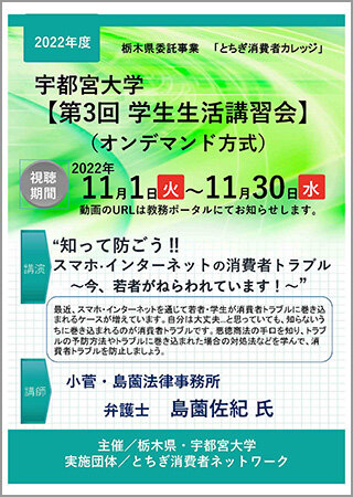 第3回学生生活講習会(オンデマンド)「知って防ごう!!スマホ・インターネットの消費者トラブル~今、若者がねらわれています!~」の動画URLを教務ポータルに掲載しました。