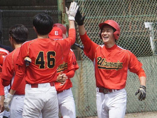 本塁打を放った今村圭佑選手兼監督(地域デザイン科学部・3年)とハイタッチをする選手たち