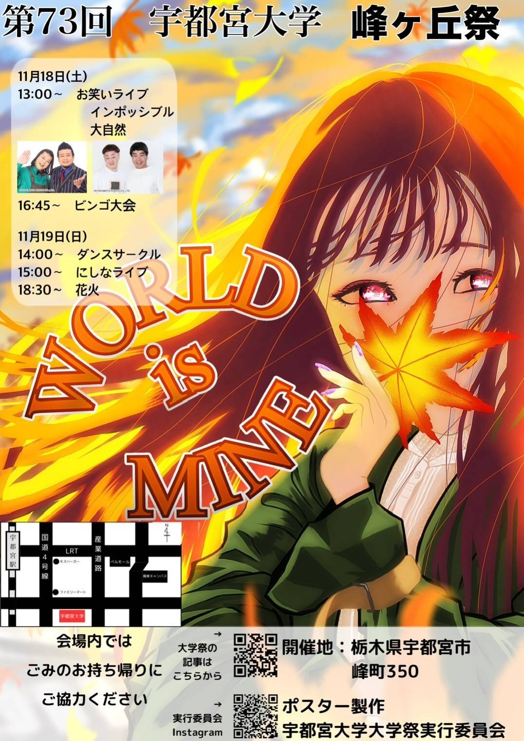 11月18日(土)、19日(日)の2日間、峰キャンパスで本学の大学祭「峰ヶ丘祭~WORLD IS MINE~」を開催します。