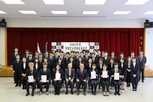 3月19日(火)、宇都宮大学大学会館(多目的ホール)において学生表彰式を開催しました。令和5年度は、以下のとおり学術研究活動、課外活動、社会活動、スポーツ振興活動の分野で顕著な功績を収めた39名の学生と11の学生団体を表彰しました。