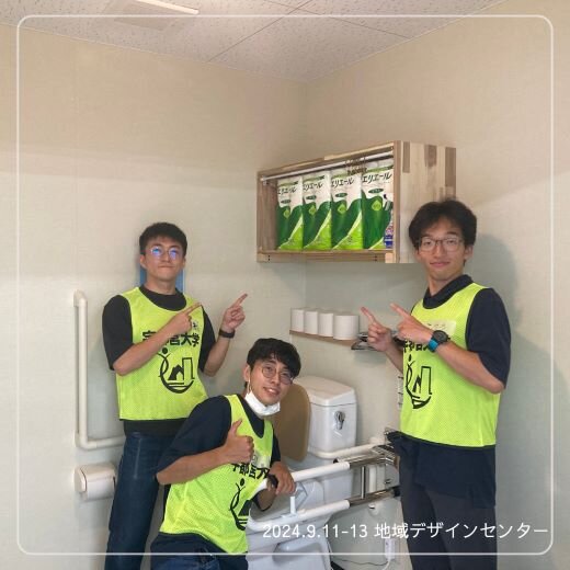 能登町にある仮設住宅集会所のトイレの収納が少なく、トイレットペーパー等が床に直置きになっているという現状をお聞きし、トイレに取り付ける棚を制作することとしました。資材・機材を現地で調達し、利用者の声をヒアリングしながら4つの集会所の棚を制作し、取り付けました。