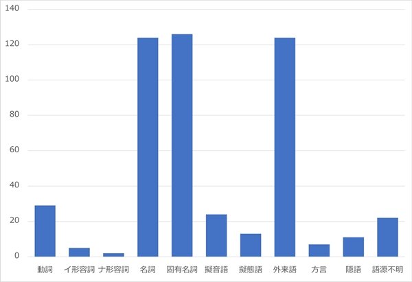 そして、どんな語幹につけられるのかというと、外来語だけでなく名詞や固有名詞につけられることが多いという結果が出ました。